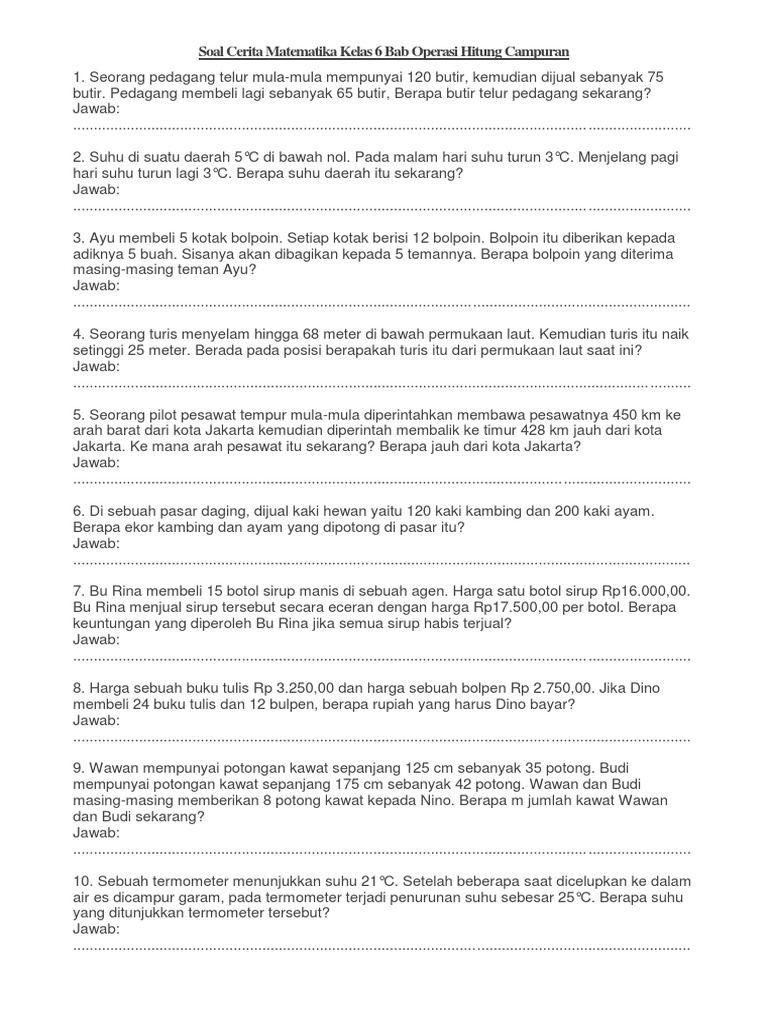 Soal Cerita Operasi Hitung Campuran Kelas 6 Dan Jawabannya doc