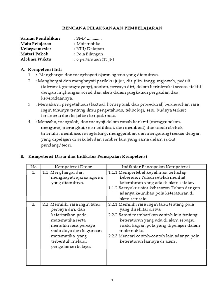Rpp Mtk Kd3 1 Pola Bilangan Kelas 8
