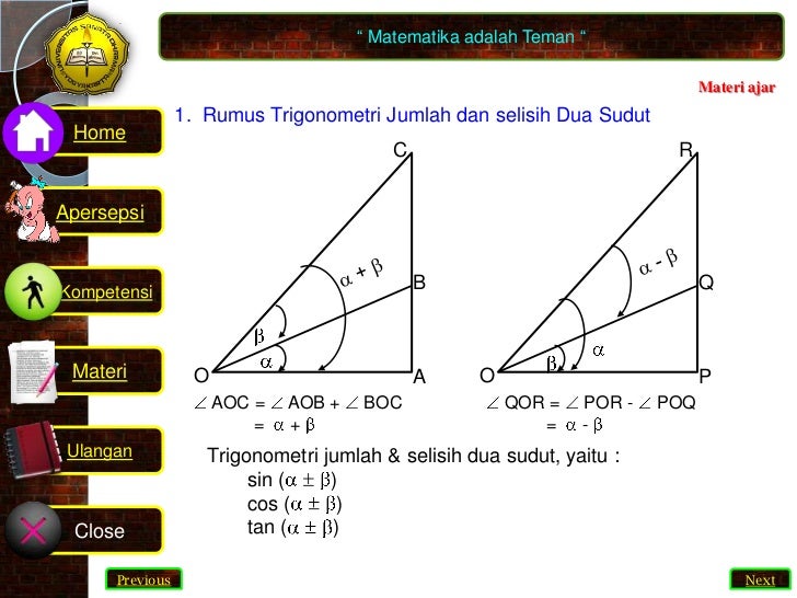 Silahkan anda cermati dan pelajari sendiri tayangan di bawah ini kemudian setelah itu anda bisa mendiskusikannya bersama teman-teman anda atau anda bisa langsung menuju ke soal-soal uji kompetensi di sini. MATERI KELAS XI. Pasti sudah saatnya kamu belajar materi pelajaran matematika tentang trigonometri kelas 11.