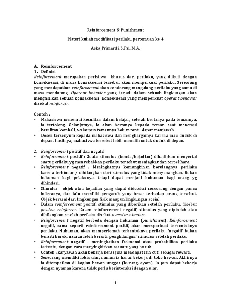 Kasus ini merupakan contoh penerapan positif reinforcement karena painful stimulus stimulus yang menyakitkan segera diberikan saat wanita itu menampar dirinya sendiri dan tingkah laku menampar diri sendiri berkurang sebagai hasilnya. Penguatan negatif Negative Reinforcement adalah Penguat yang berasal dari pemindahan atau penghindaran suatu kejadian negatif sebagai konsekuensi dari perilaku. Contoh reinforcement negative yaitu Ani adalah seorang sekertaris ia mendapatkan banyak tugas dari atasannya.