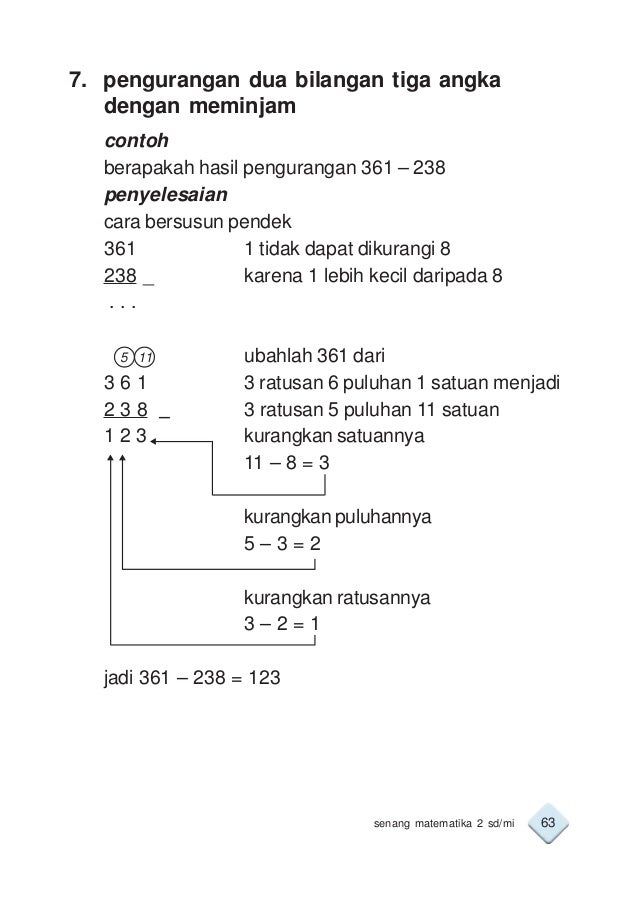 Pikirkan bilangan-bilangan dari 1 hingga 15 kemudian buang atau kembalilah 9 unit sehingga kamu mendapatkan 6. Tapi dilihat dari kenyataan dilapangan tepatnya di SD Negeri II Watesnegoro Ngoro di kelas II ada beberapa siswa yang belum bisa menyelesaikan operasi hitung penjumlhan dan pengurangan bilangan cach menggunakan cara bersusun.