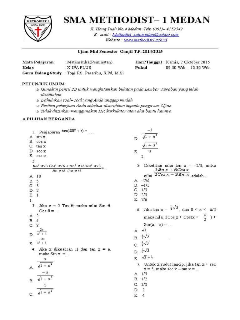 Soal Uts Genap Mat Peminatan Kelas X Plus 2015 2016
