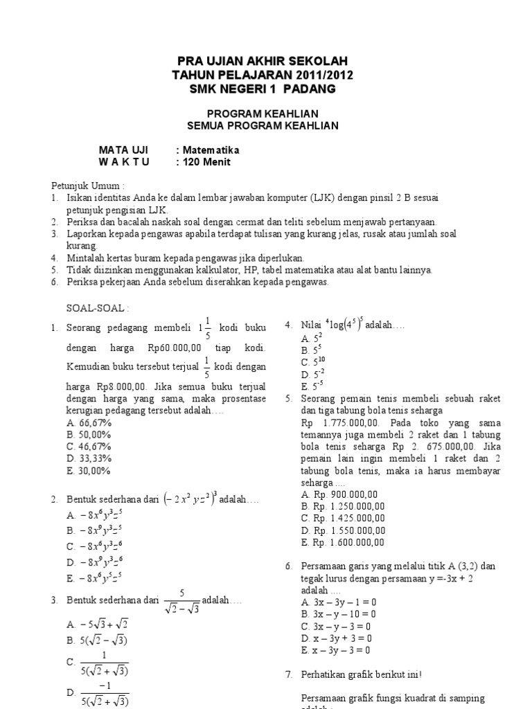 Soal matematika smk kelas 10 semester 2 kurikulum 2013 soal matematika kelas 10 semester 2 dan jawabannya soal uts matematika kelas 10 semester 2 dan pembahasannya materi matematika kelas 10 semester 2 smk soal matematika wajib kelas 10 semester 2 soal matematika kelas 10 semester 1 dan jawabannya 2020. SOAL UN MATEMATIKA SMK 2011. Penjualan dan Akuntansi 22 2.